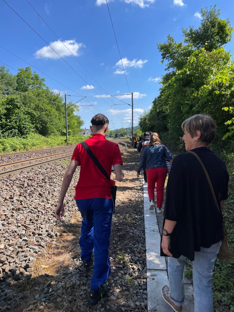 At some point they come on the train to tell us they are getting us a bus that will take us to the station. I have no idea how we are getting to said bus because the tracks appear to be deep in the French countryside.