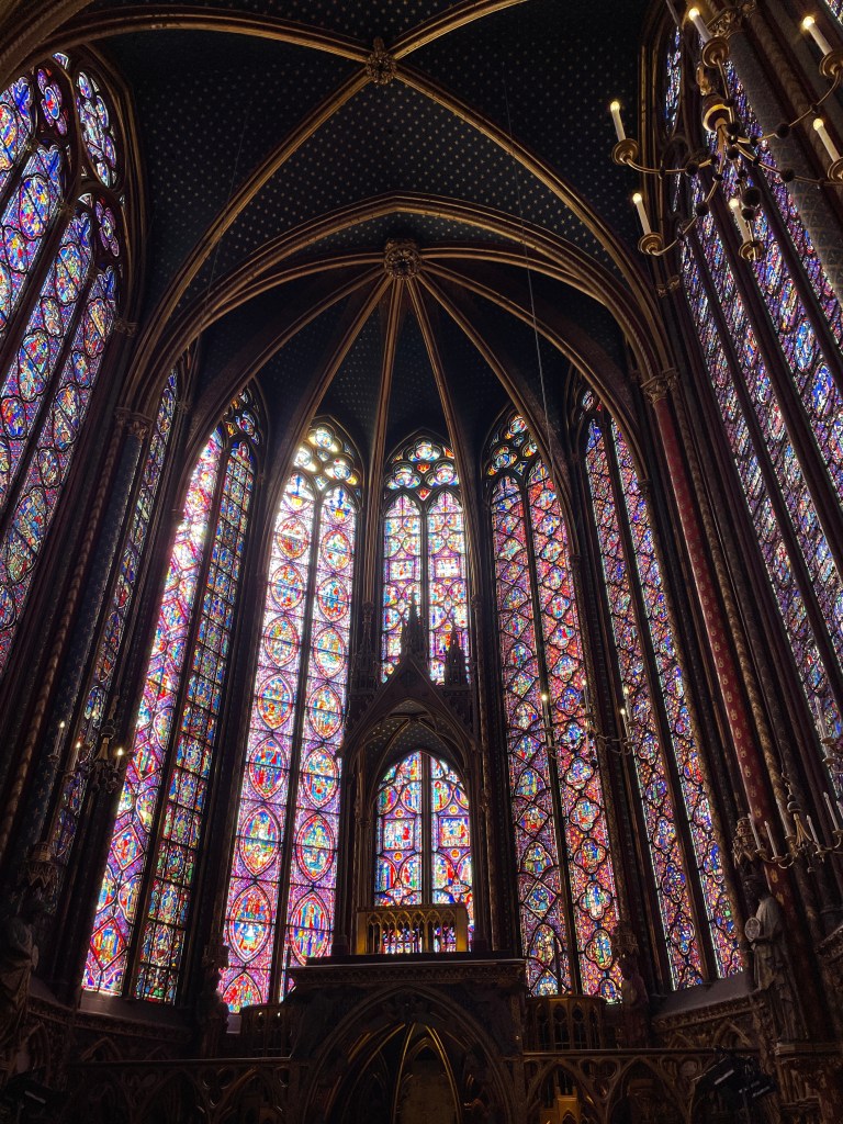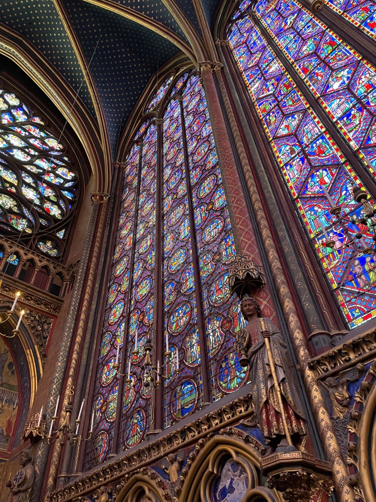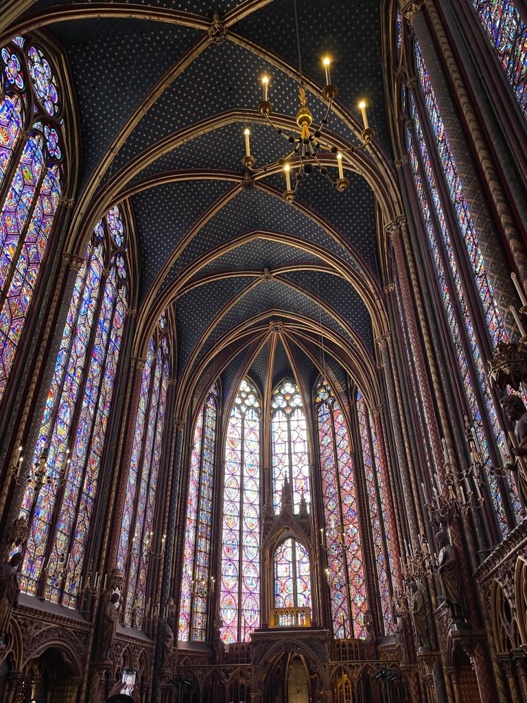 We walked over to Sainte-Chapelle. We decided we needed to see this one, especially since Notre Dame is still being restored from the fire. This is another I’ve learned in every art and architecture history class I’ve ever taken. Known for the stained glass work and structure. We walk in and it is much tinier than I ever thought it would be. I guess in all of the photos I’ve seen there were no people for scale. I thought it would be as big as any of the others I had been through recently, but it is so small. Magnificent, nonetheless.
