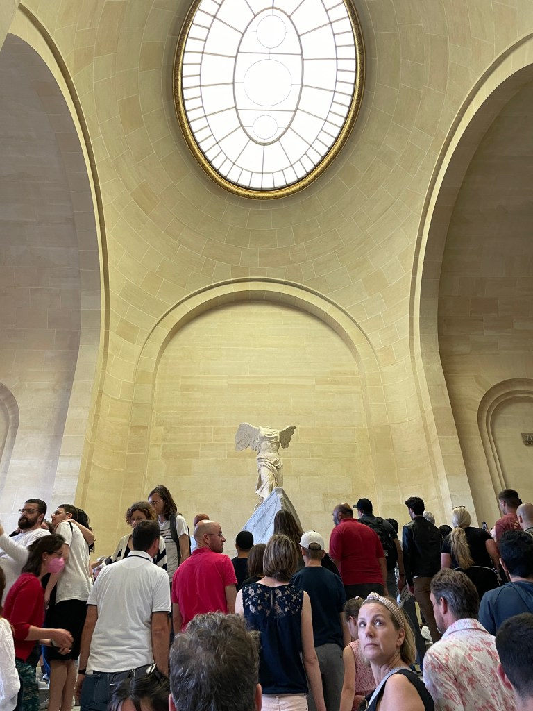 We start weaving our way through the museum and the crowds of people. Down through the galleries, up some stairs, and there’s the Winged Victory. Beautiful. Just standing quietly while people mill about, up and down the stairs.