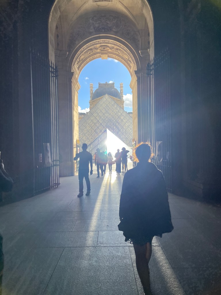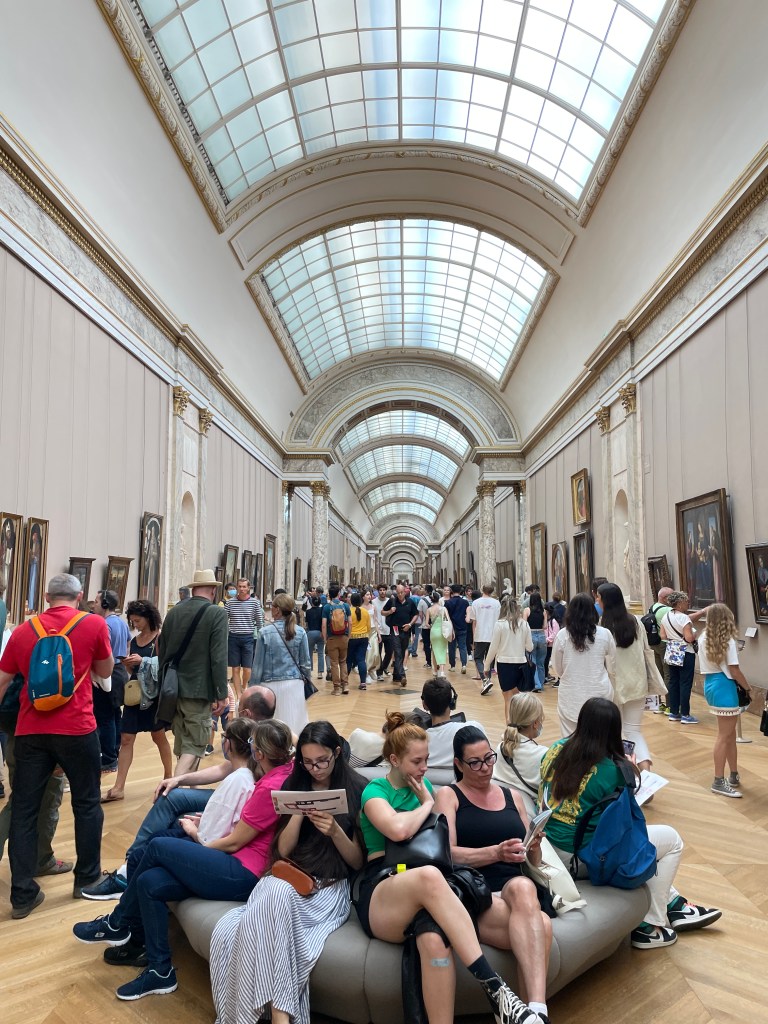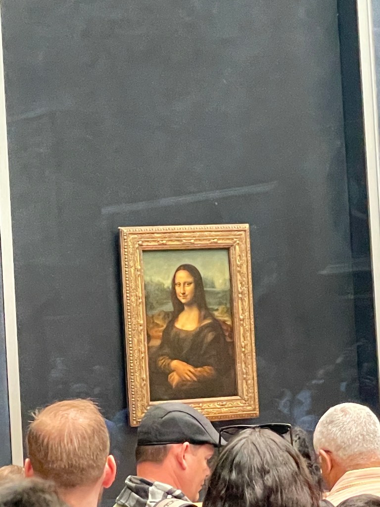 The Seated Scribe must be on loan at another museum because we can’t find him. So we make our way to see the Mona Lisa. Up a flight of stairs, down through a gallery, down some stairs, back up. We were lost. Rerouting. And back on track to the Mona Lisa.