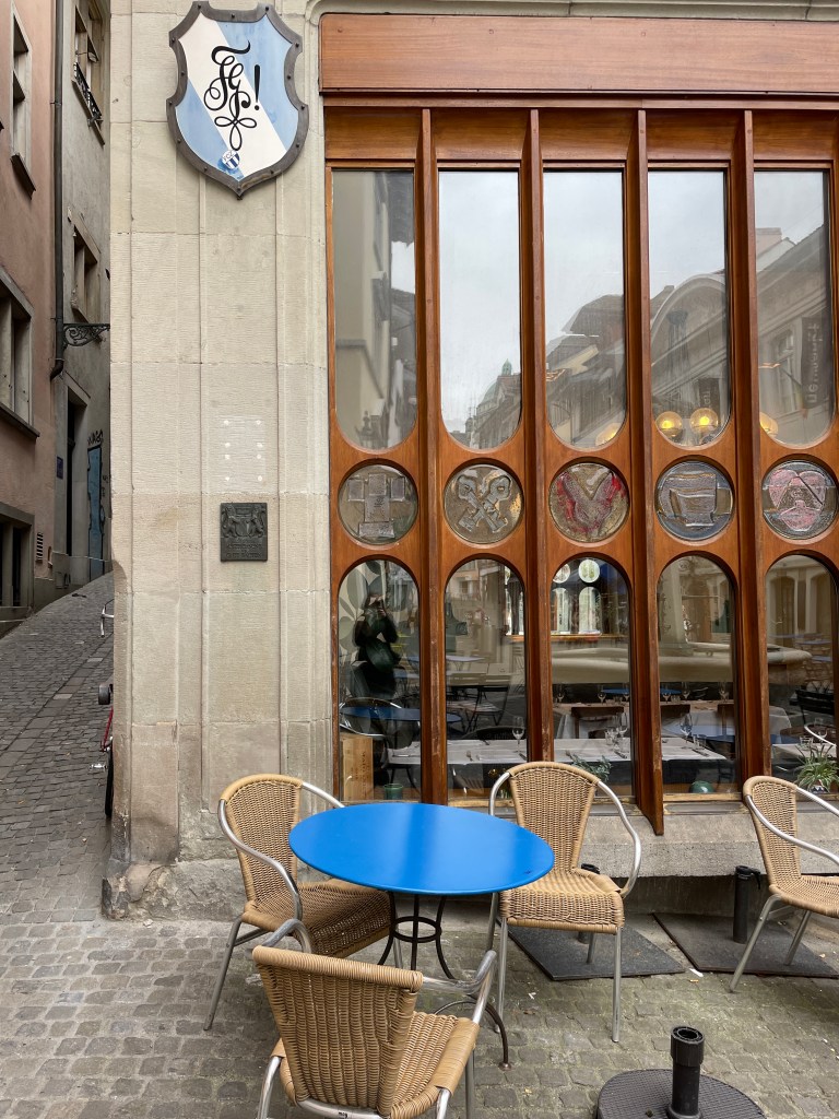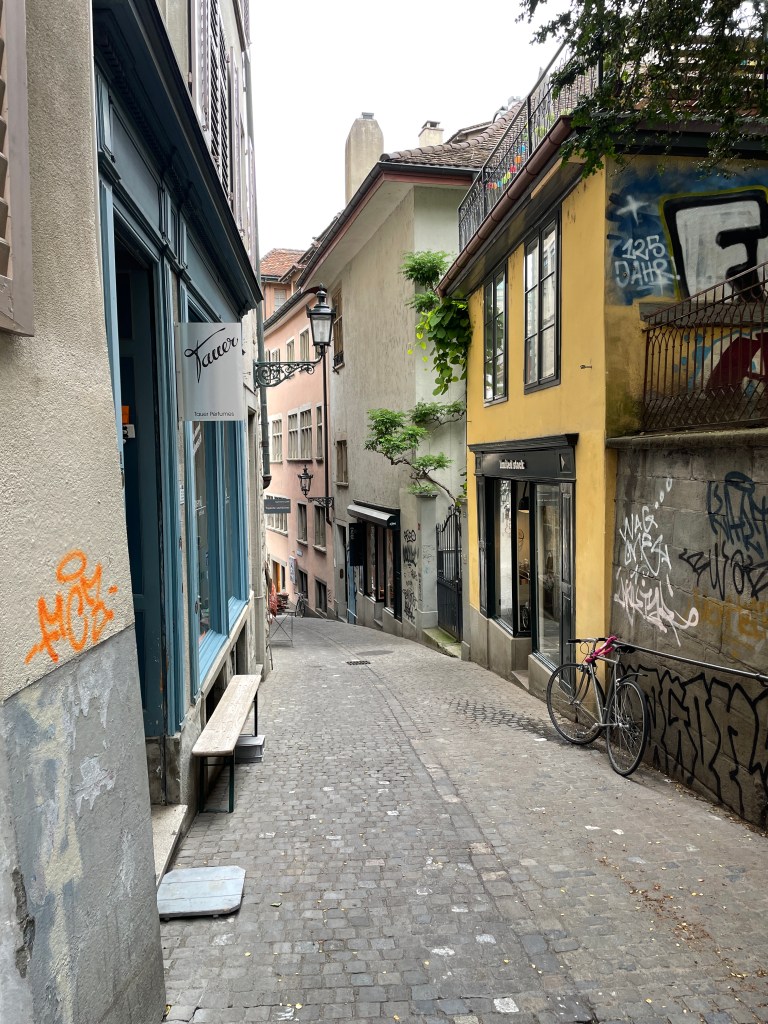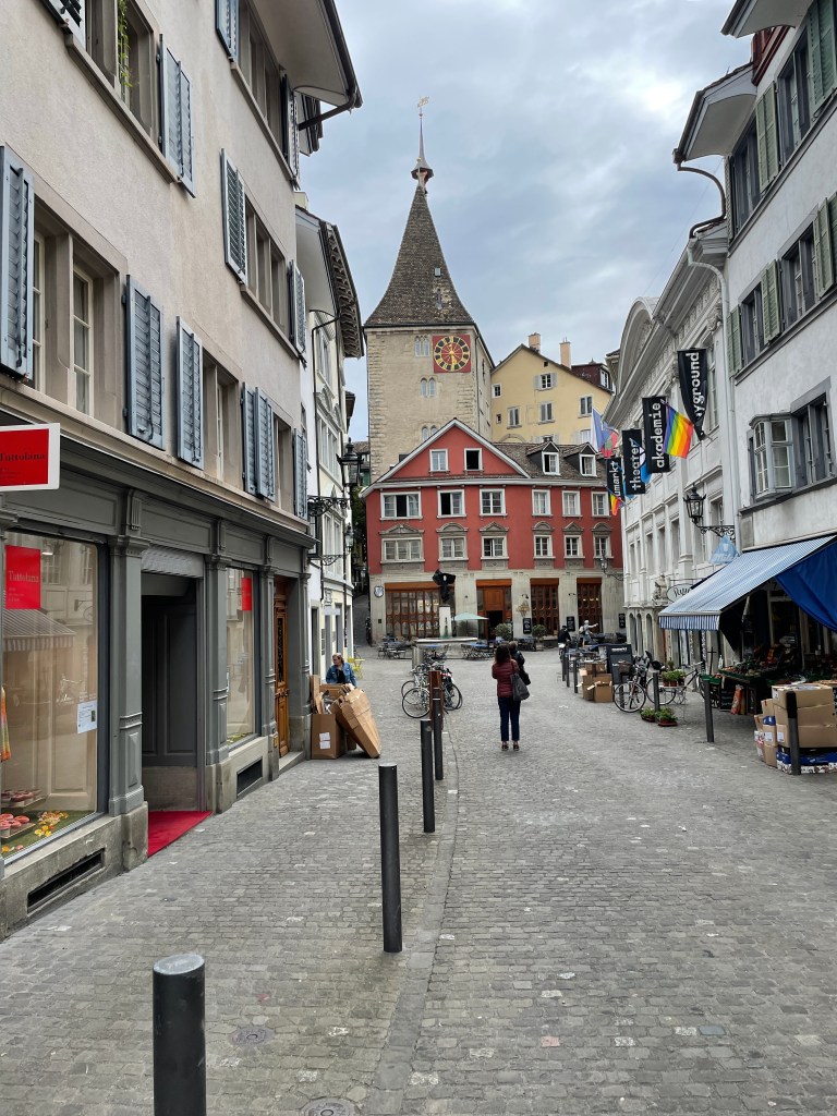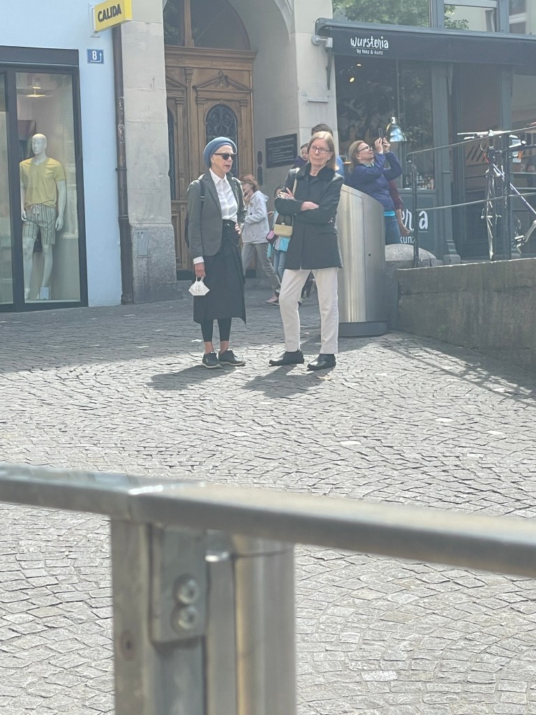 I’m only in Zurich for about 48 hours. It is so beautiful. The weather is cool, rainy. Everyone is nice. And beautiful. Everyone is so beautiful. I also fit right in here–lots of people wearing mostly black, and earth-toned colors. Very simple pieces, color-blocked patterns, they have really good backpacks. I want a new cute backpack so bad, but no other back to put it on. My octogenarian art teacher style was made for this place.