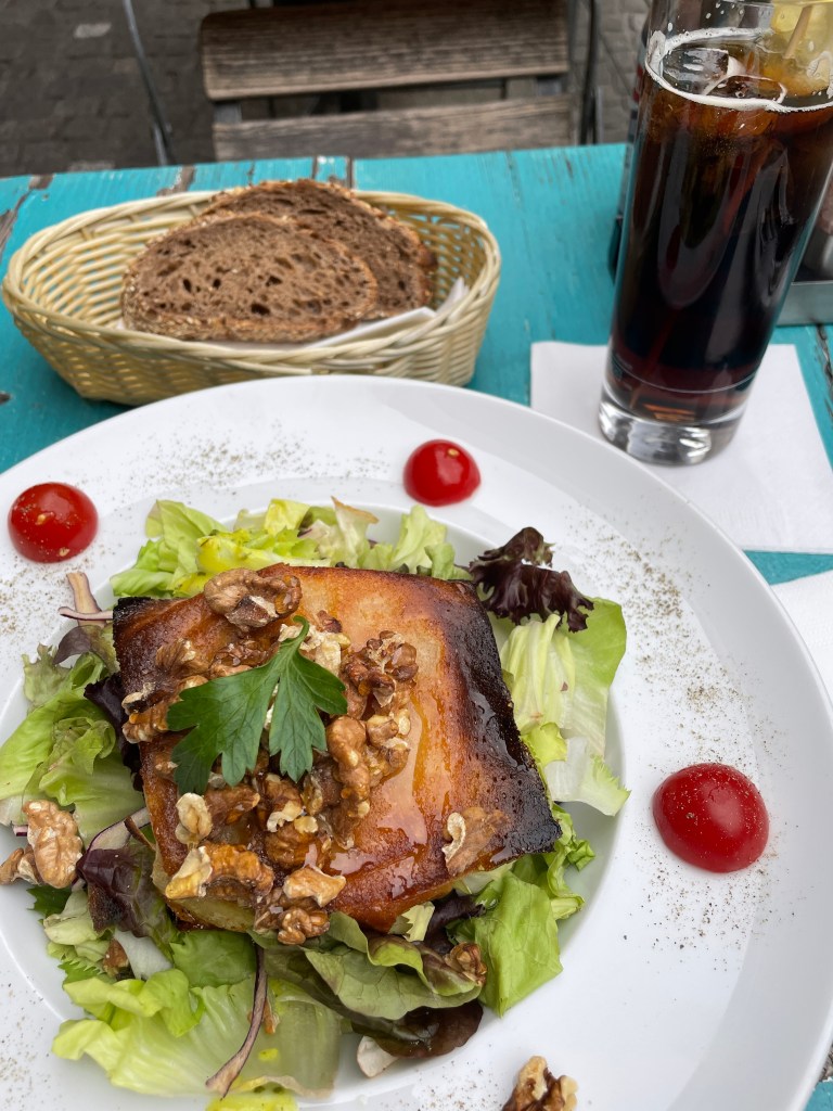I have the best salad of my life. Warm goat cheese, baked in some kind of dough, with honey and walnuts, on a bed of lettuce with house dressing. And a whiskey coke because I haven’t had that since I left Memphis. Reminds me of home.