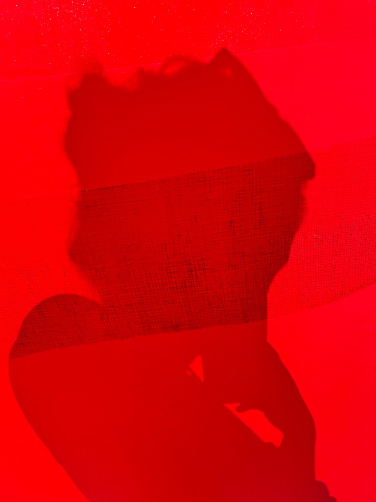 I walk through the gallery with my new Bruce lenses. An entire exhibit called “Contrapposto Studies”. Though this is very different than David’s contrapposto stance. Him walking through his studio in this way, turning around, walking back. A piece of performance art with a woman walking in such a way through the gallery. Him walking through his studio and turning around, but the video is split horizontally through the middle and the two pieces are slightly off. You get to wear 3D glasses for this part. Enormous screens of his hands in different positions. I love it. And I think of the process. And all the while walking through Ando’s concrete.