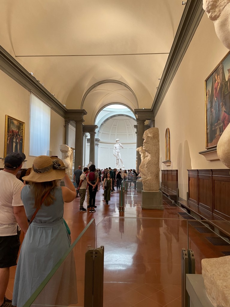 In this very tiny gallery you turn a corner and see the statue from across the length of the building. It really is beautiful. Bathed in sunlight. Standing above the crowd of people.