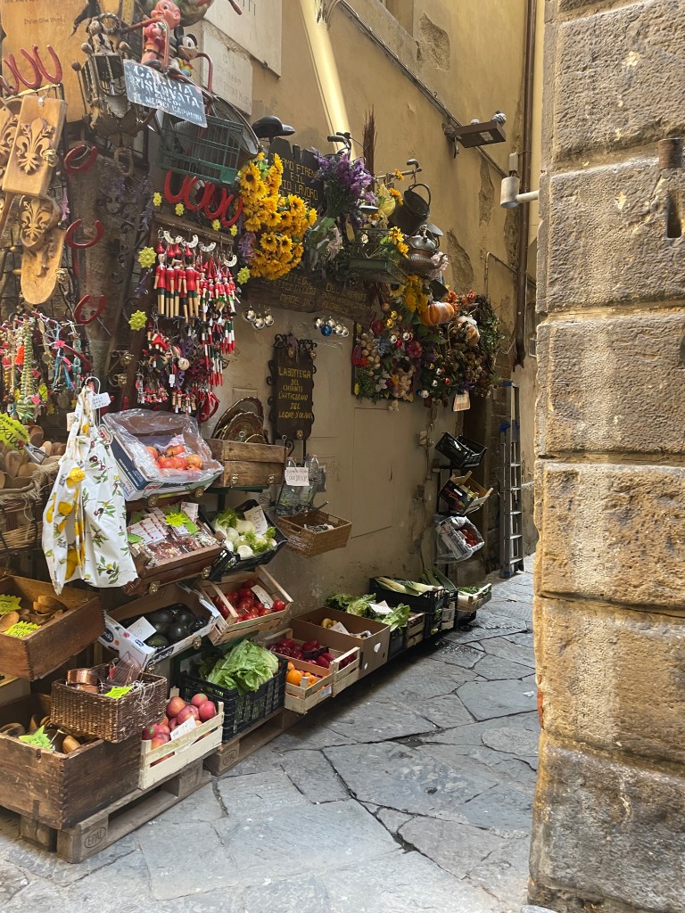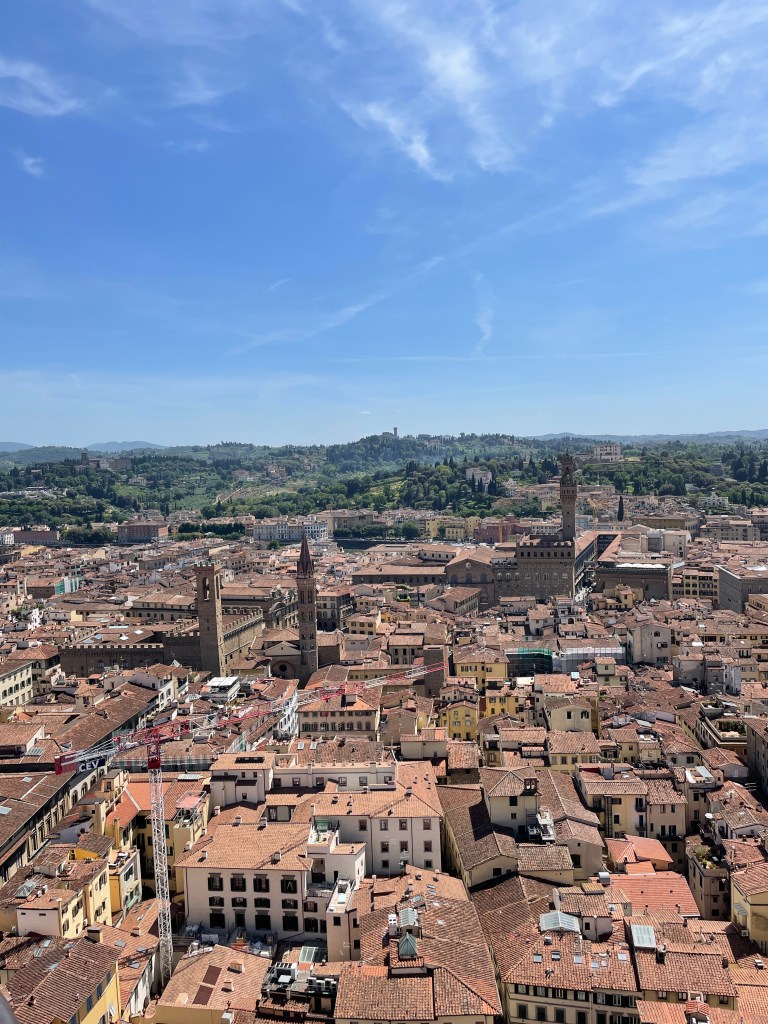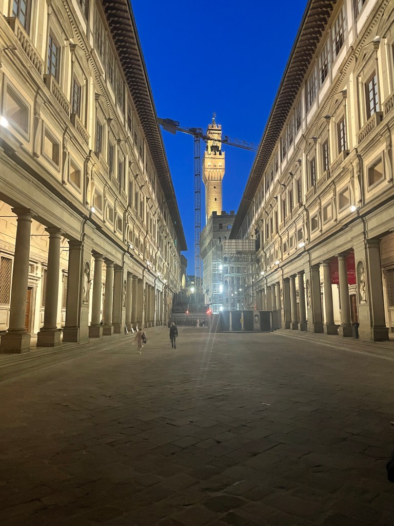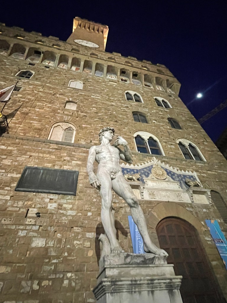 Dinner was lovely. I sat in the Piazza degli Uffizi for a while. A violinist was there. It was lovely. And now I’m sitting on the rooftop of my hotel writing this with a glass of wine and a view of il Duomo. A group of older folks, old friends, sitting behind me. They get up to leave—“you finish your homework now.”