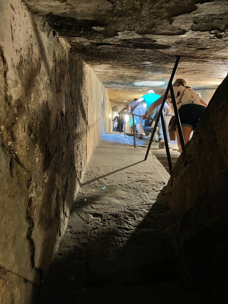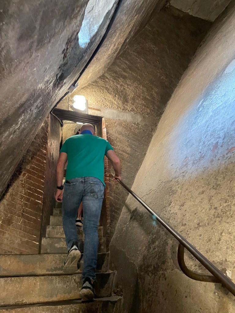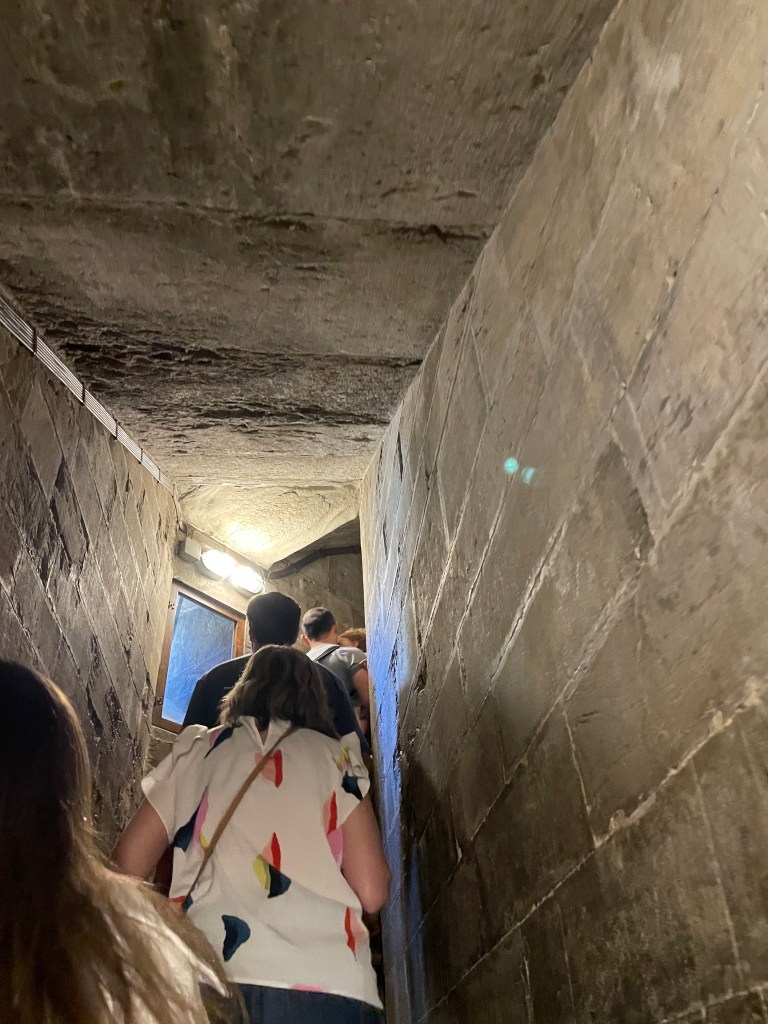 I finally get there, stand in line, and start walking up. Very similar to the last—tight walk, lots of people—though the way down is also the same as the way up, not separate. People tight against the wall when we cross paths. Not enough room for that, but it’s fine.