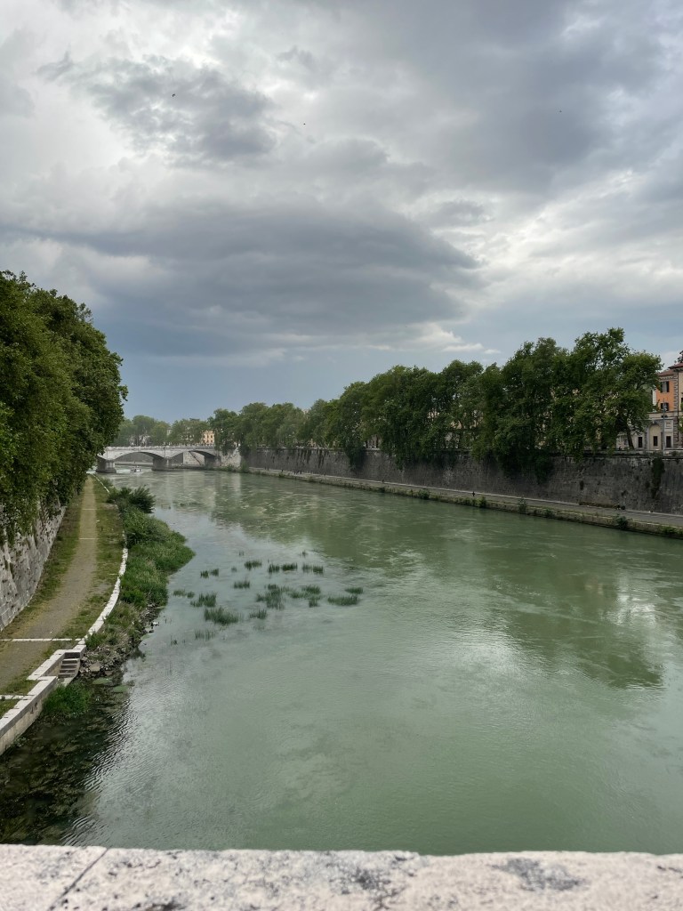 A storm or something is blowing through. The trees lining the sidewalk of the Tiber are moving violently in the wind. Branches fall on cars and the dust, pollen, something billows up from them in clouds. Everyone is rubbing their eyes. I sneeze so many times. My eyes are watering. Nope. Bad idea. Turning around.