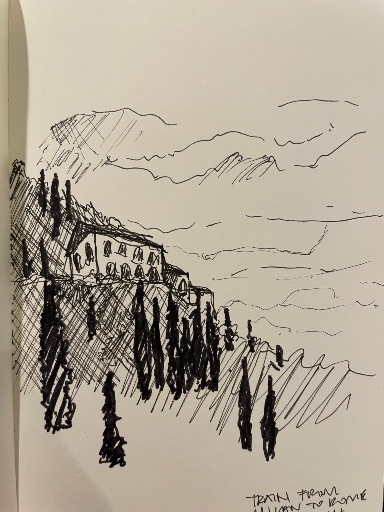 I wake up at some point to the Italian countryside. It’s so strange to me how “the country” is similar to what I see when I drive through “the country” at home. Houses out in the middle of nowhere, some nice, some not so much, trees, roads, power lines. That’s it really. But the cypress trees were a wonderful addition.