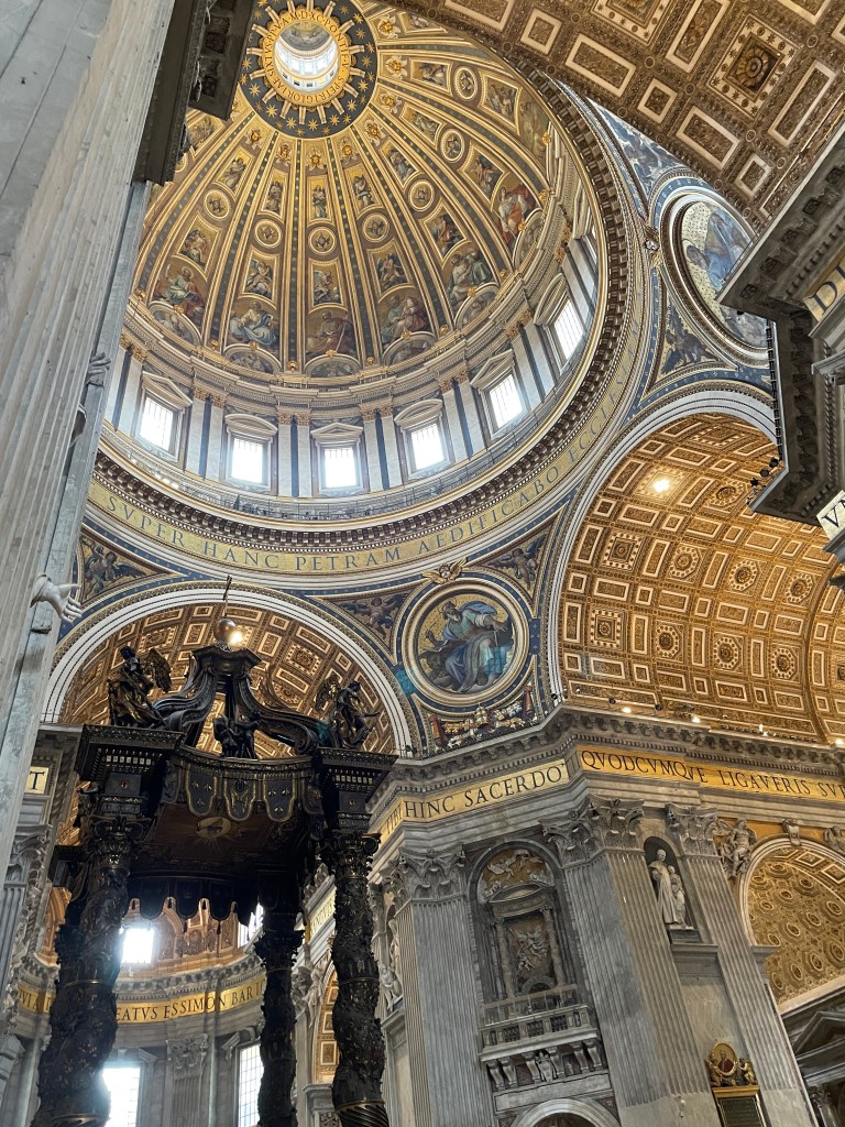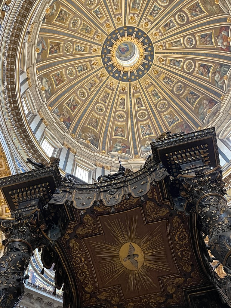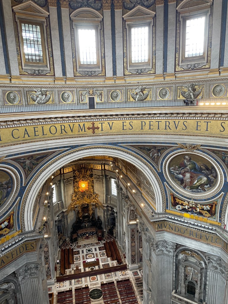 I get to the dome and look down. There it is, the Baldacchino. Wow. Bronze. Enormous. The entire space is incredible. So much all around. And just a vast space. Every inch dazzling.