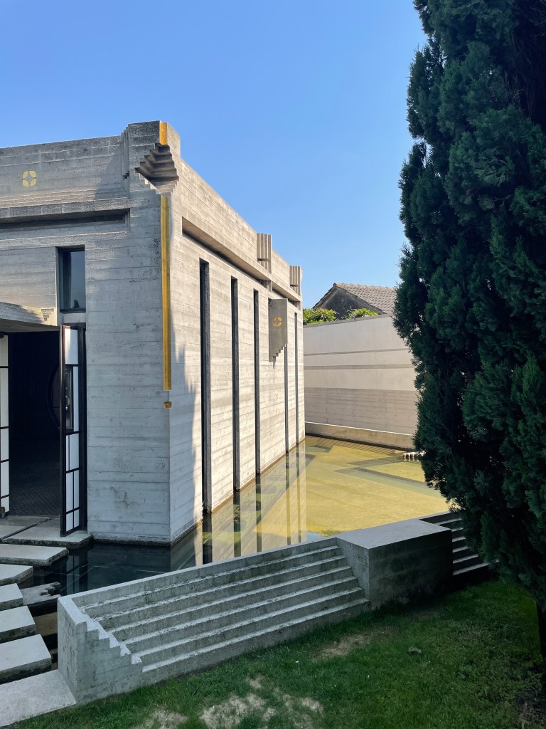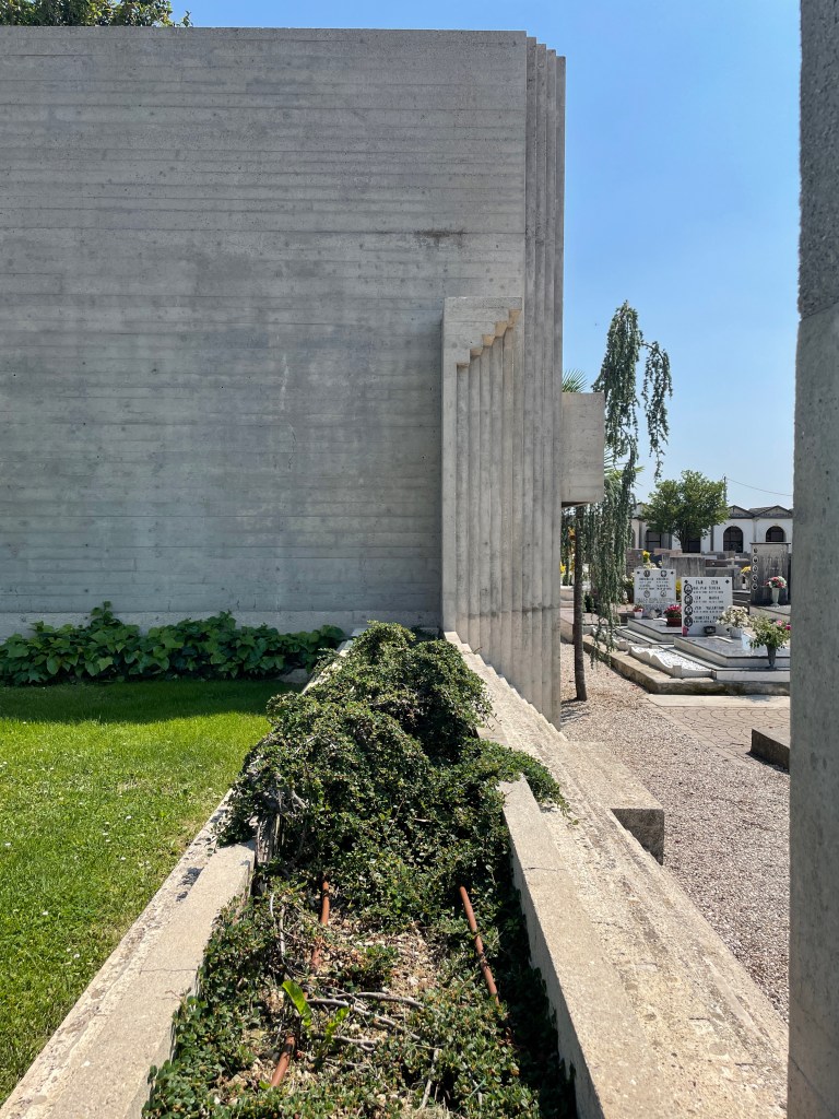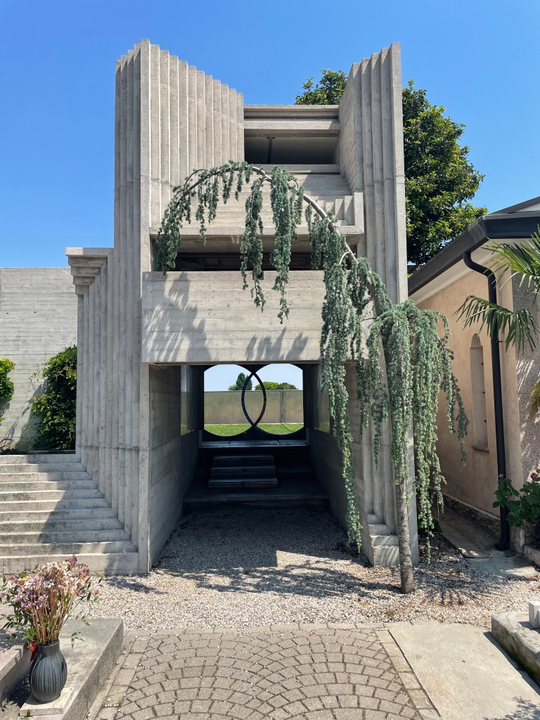You walk through a number of above ground graves and mausoleums with flowers and photos and headstones, but you see the Brion Tomb upon entry. In fact, you can see it from the street, through the grove of trees. A powerful terminus, just like he imagined.