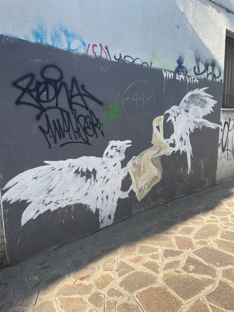 I ride with them five minutes to their stop. They speak to the driver in Italian. He looks back to me, “All the taxi drivers, bus drivers on strike. Today is a bad day to be trying to get somewhere.” Great.